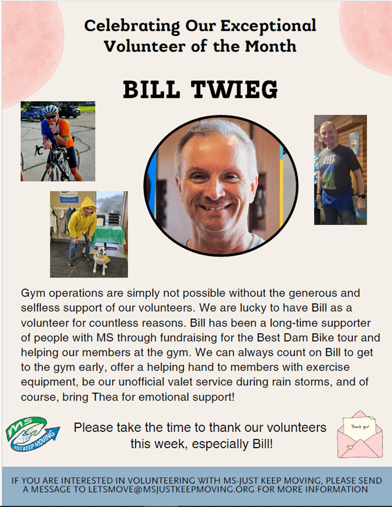 These classes are aimed to get everyone exercising together. I like that word “together” 😊. We’ll need help from volunteers before and after the cardio class on Wednesdays and Fridays to get members on and off equipment. All are welcome and encouraged to join…friends with MS, volunteers, and caregivers.