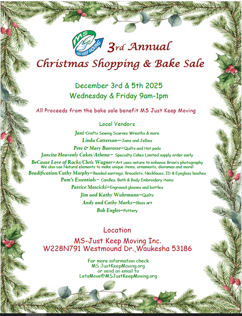 MS-Just Keep Caring – Our Caregivers support group will be the first and third Friday of each month from 10:00 – 10:30am. The next one will be Friday, December 5th, 2025. If you’re a caregiver of someone you love with MS, please join us and share your experience of caring for your loved one. This has been very helpful for many. Thanks to all who participate!