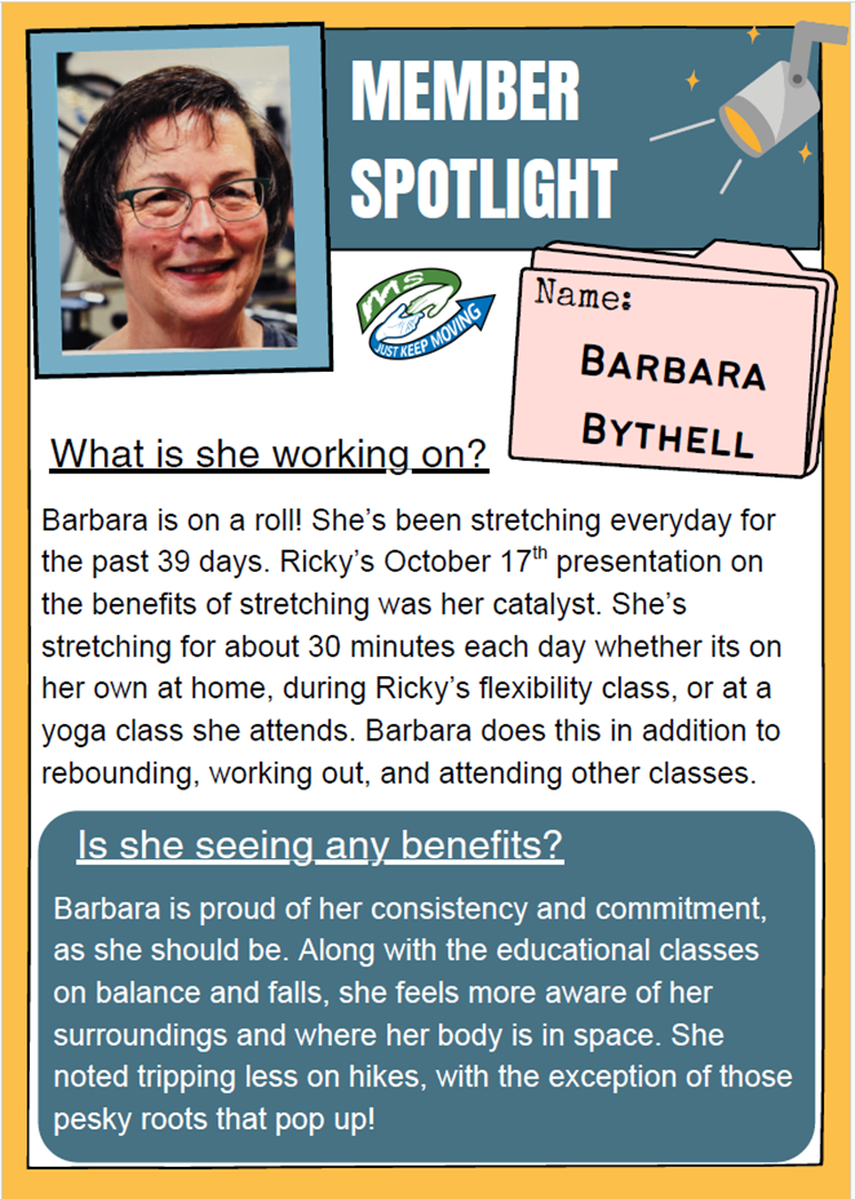 These classes are aimed to get everyone exercising together. I like that word “together” 😊. We’ll need help from volunteers before and after the cardio class on Wednesdays and Fridays to get members on and off equipment. All are welcome and encouraged to join…friends with MS, volunteers, and caregivers.