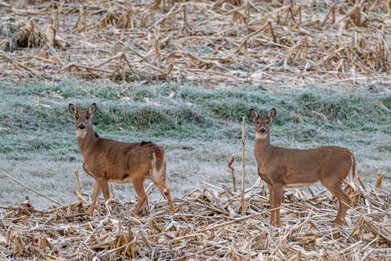 P.S. It was opening weekend for gun season deer hunting this past weekend. Did I go hunting? Not with a gun, just with my camera. The morning started out seeing these two doe in the frosty corn /grass.