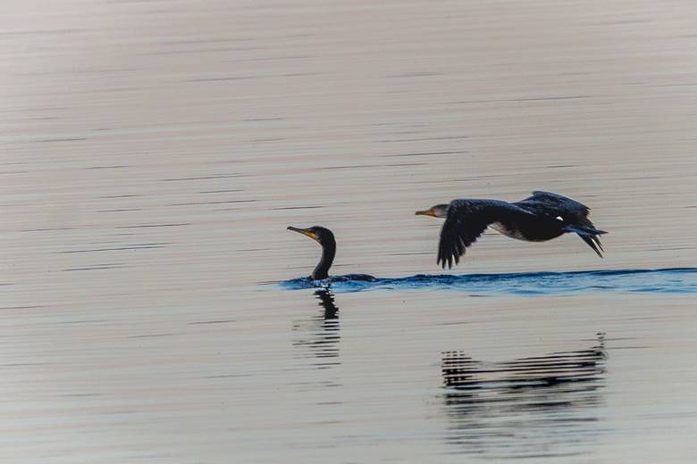 One Double-crested Cormorant was swimming and another one did a fly by