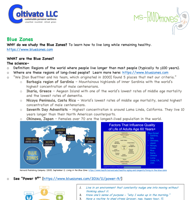 This week, Janine and friends at the Nutrition program talked about the Blue Zones. This is an interesting topic. How many people in your circle live to be over 100 years old? What can we learn from them?