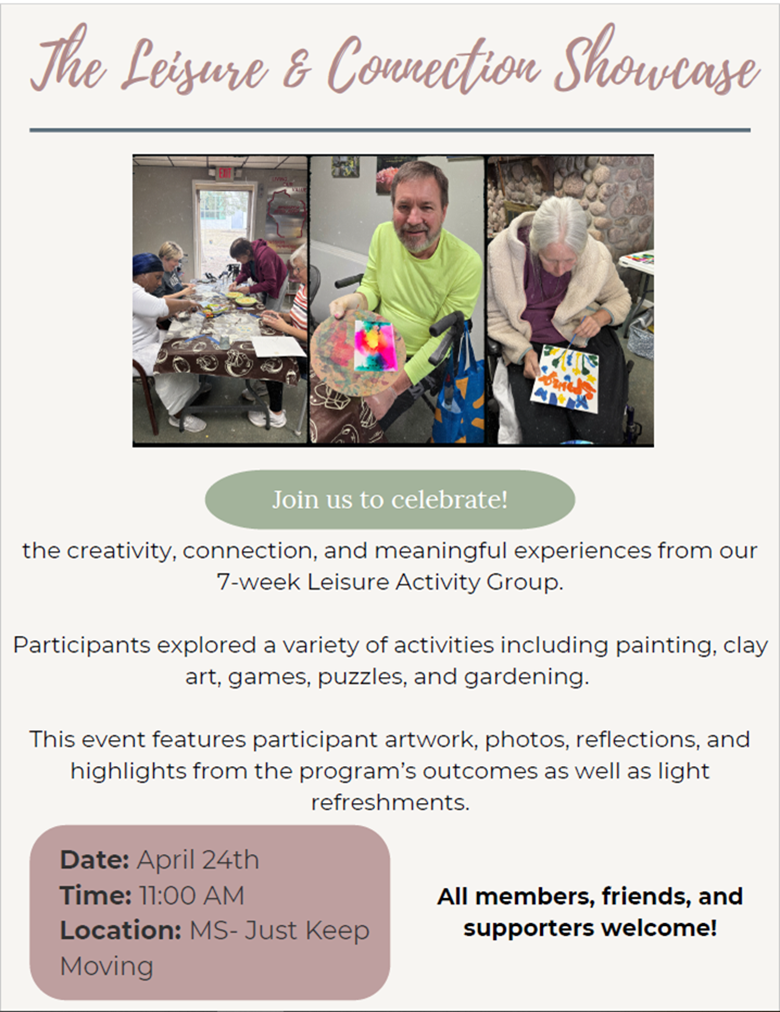 Friday, April 24th 11:00 – 12:00pm: Christina, doctoral OT student at Concordia University, and the participants of her leisure activity group will showcase what they’ve been up to the last 7 weeks. We’ll get to see what painting, making, creating and laughing together can do for us living with MS.