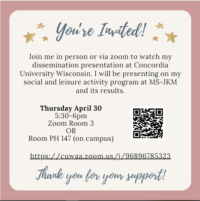 We will also have an opportunity to witness and support Christina when she presents her summary to Concordia College. Let’s thank Christina and Concordia College for choosing to do her capstone project here with us.