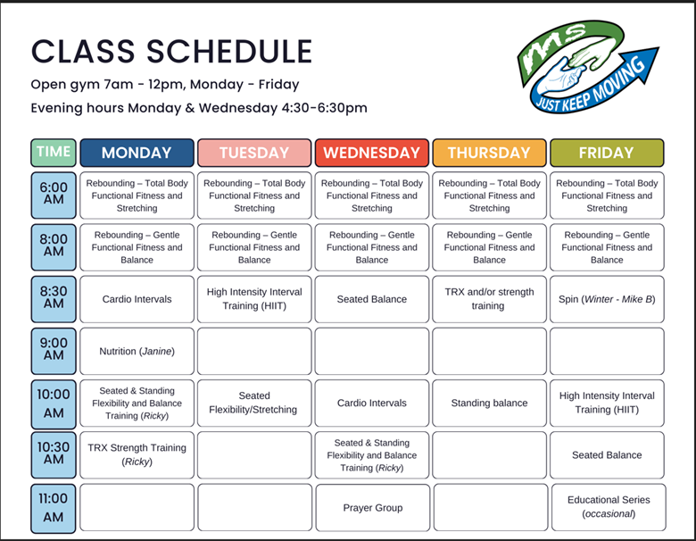 Exercise class schedule (to start 3/16/25). Feedback welcome to make this as best as it can be!