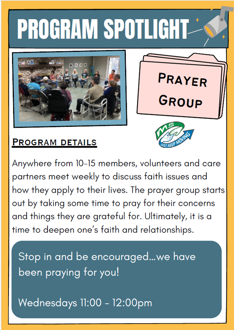 MS-Just Keep Caring – Our Caregivers support group will be the first and third Friday of each month from 10:00 – 10:30am.  The next one will be this Friday, March 20th, 2026.  If you’re a caregiver of someone you love with MS, please join us and share your experience of caring for your loved one.  This has been very helpful for many.  Thanks to all who participate!