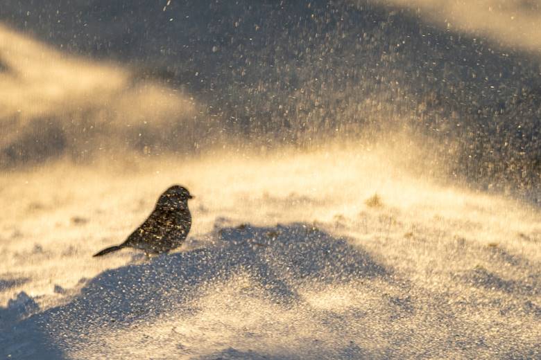 As the sun started to set and the wind was blowing the snow / ice around, this little bird was still hungry.