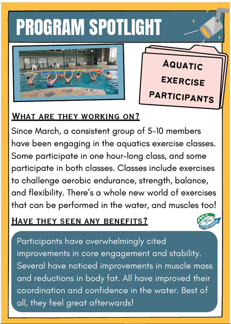 This week we are spotlighting one of our programs that has been very beneficial to our friends with MS. Our Aquatics Exercise Program that we have every Tuesday afternoon. We would like to see more people benefitting from this program. To benefit from it, you must show up and do it. It’s FUN!