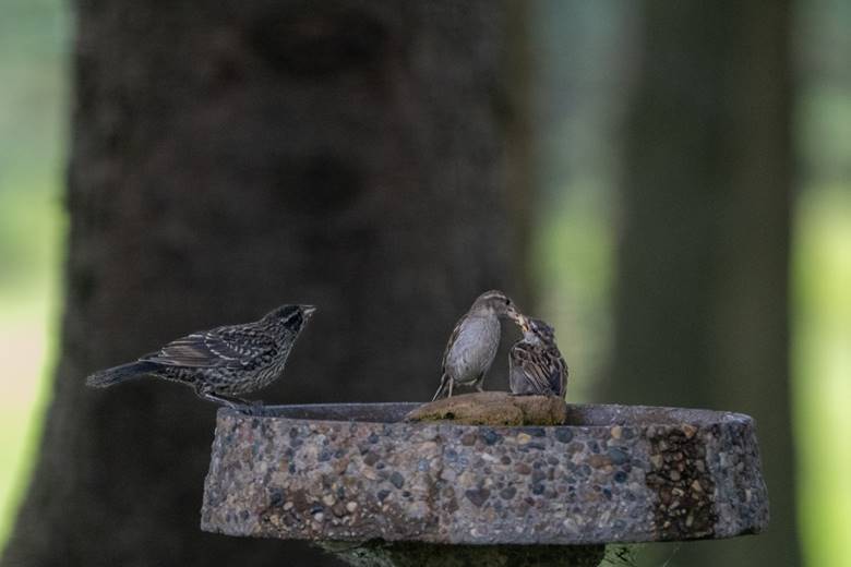P.S. This week, I saw another variety of events out in nature. This little bird was feeding a younger bird on our bird bath with another bird taking notes. I’ve never seen that before and thought it was interesting.