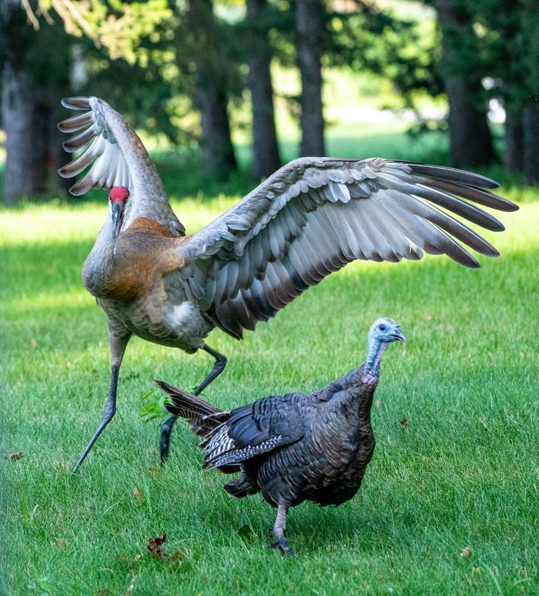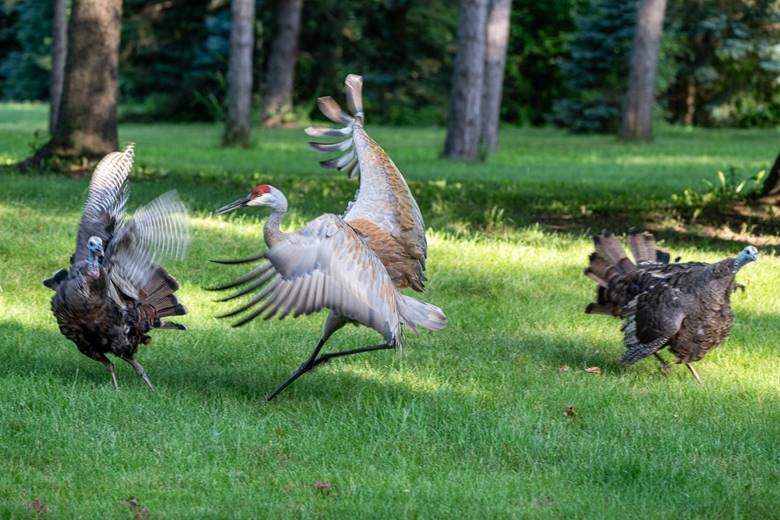 Sometimes the cranes surrender and sometime the turkeys do. This time, the cranes surrendered. Don’t worry, none of them were hurt.