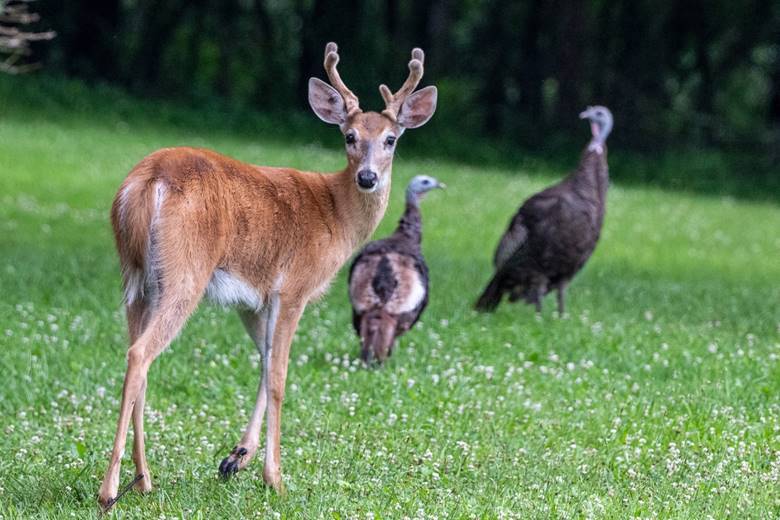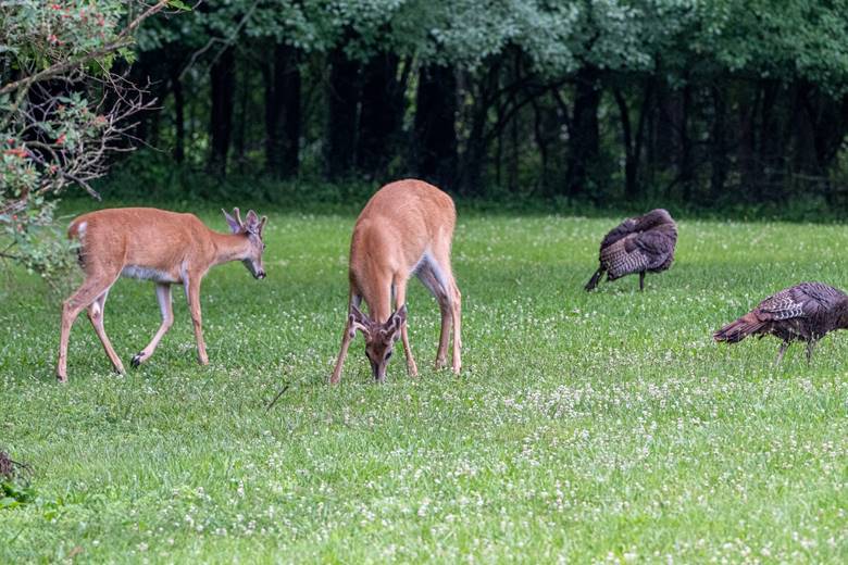 Even though the cranes and turkeys weren’t getting along, the deer and turkey had no problem with each other.