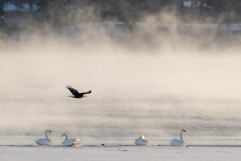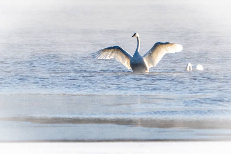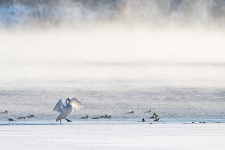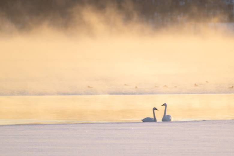 When the sun was rising, these swans looked nice out there with the steam coming off the water.