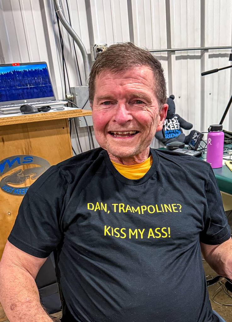 Well, Rick is getting a little out of hand. If you were there when Rick was here last Wednesday, he wanted to make an announcement and demonstration. Rick explained to everyone that I like to encourage him to get on the trampolines, even if he’s fatigued. He had a T-shirt made to let me know his answer to the trampoline when he’s fatigued. All in good fun 😊