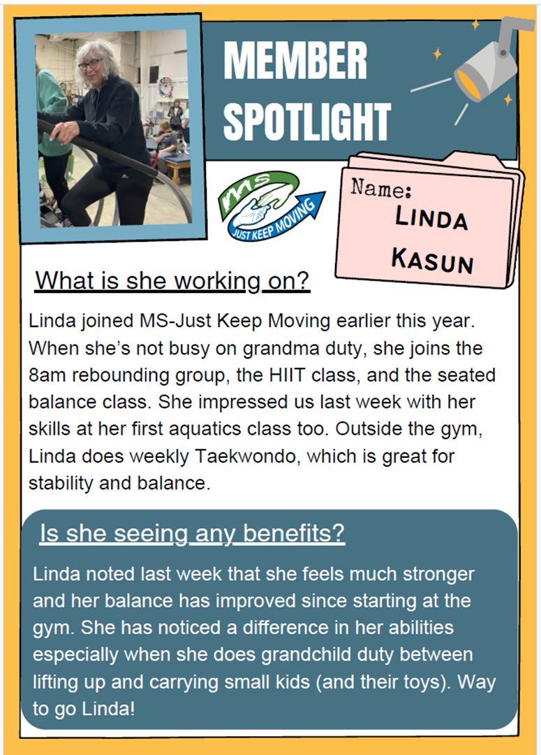 These classes are aimed to get everyone exercising together. I like that word “together” 😊. We’ll need help from volunteers before and after the cardio class on Wednesdays and Fridays to get members on and off equipment. All are welcome and encouraged to join…friends with MS, volunteers, and caregivers.