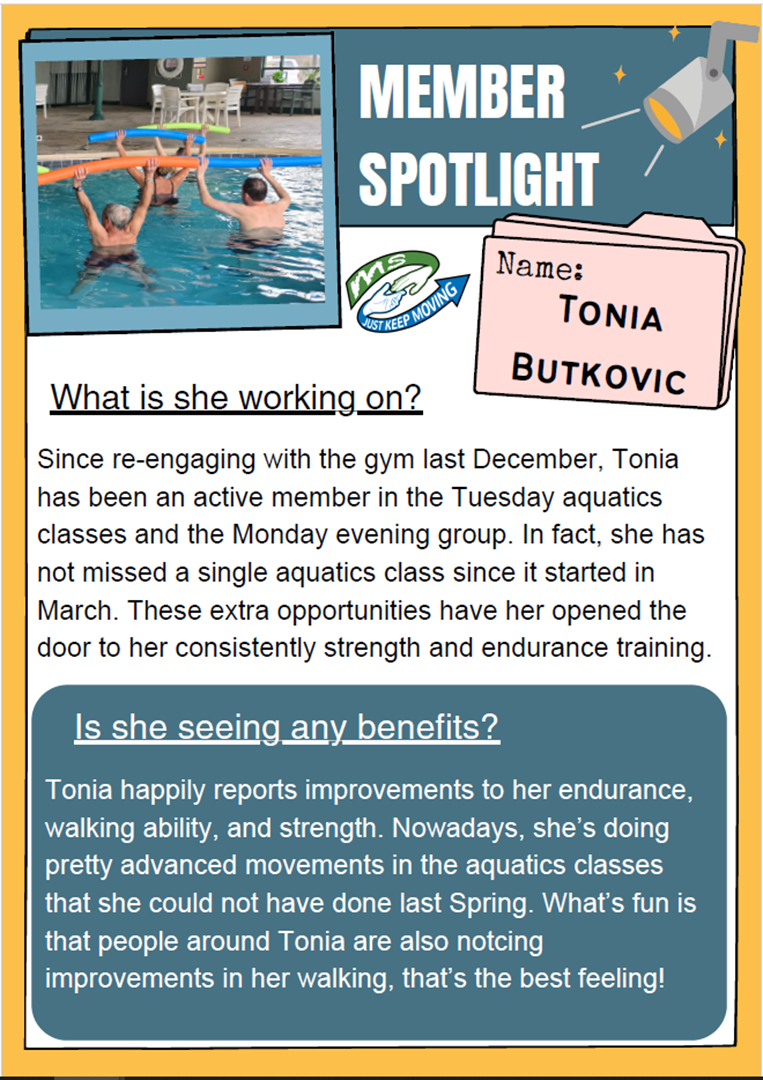 I’m so happy to hear Tonia has been so consistent in the water aerobics program, Monday evening program and making progress. Great job Tonia!
