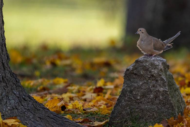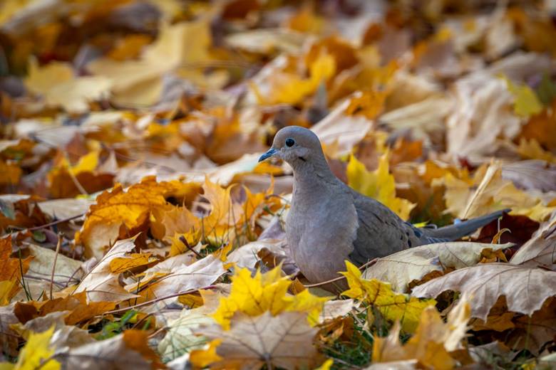 The doves stand out with the colored leaves in the background.