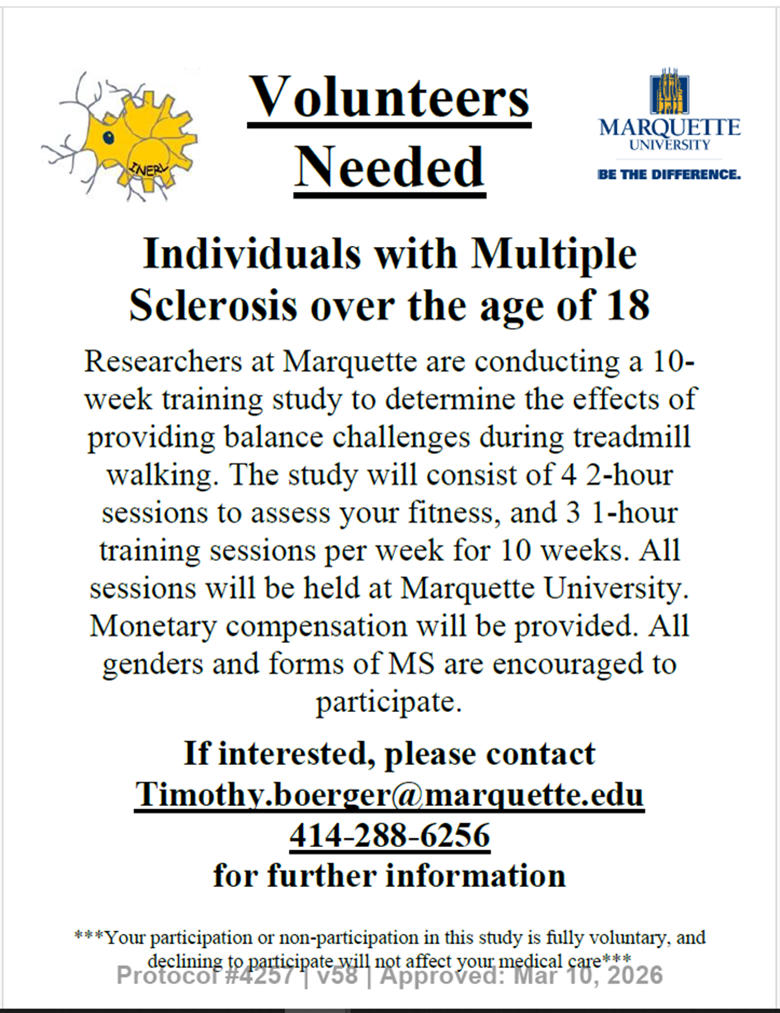 Here’s a research opportunity that Marquette University is doing for all of living with MS. I would highly encourage you to engage in this if you qualify.